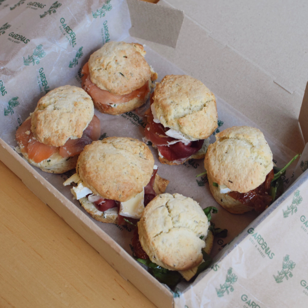 CAJA SCONESCaja de scones de hierbas rellenos surtidos x 62 de salmón trucha ahumada2 de jamón crudo y queso brie2 de tomates secos, rúcula y queso