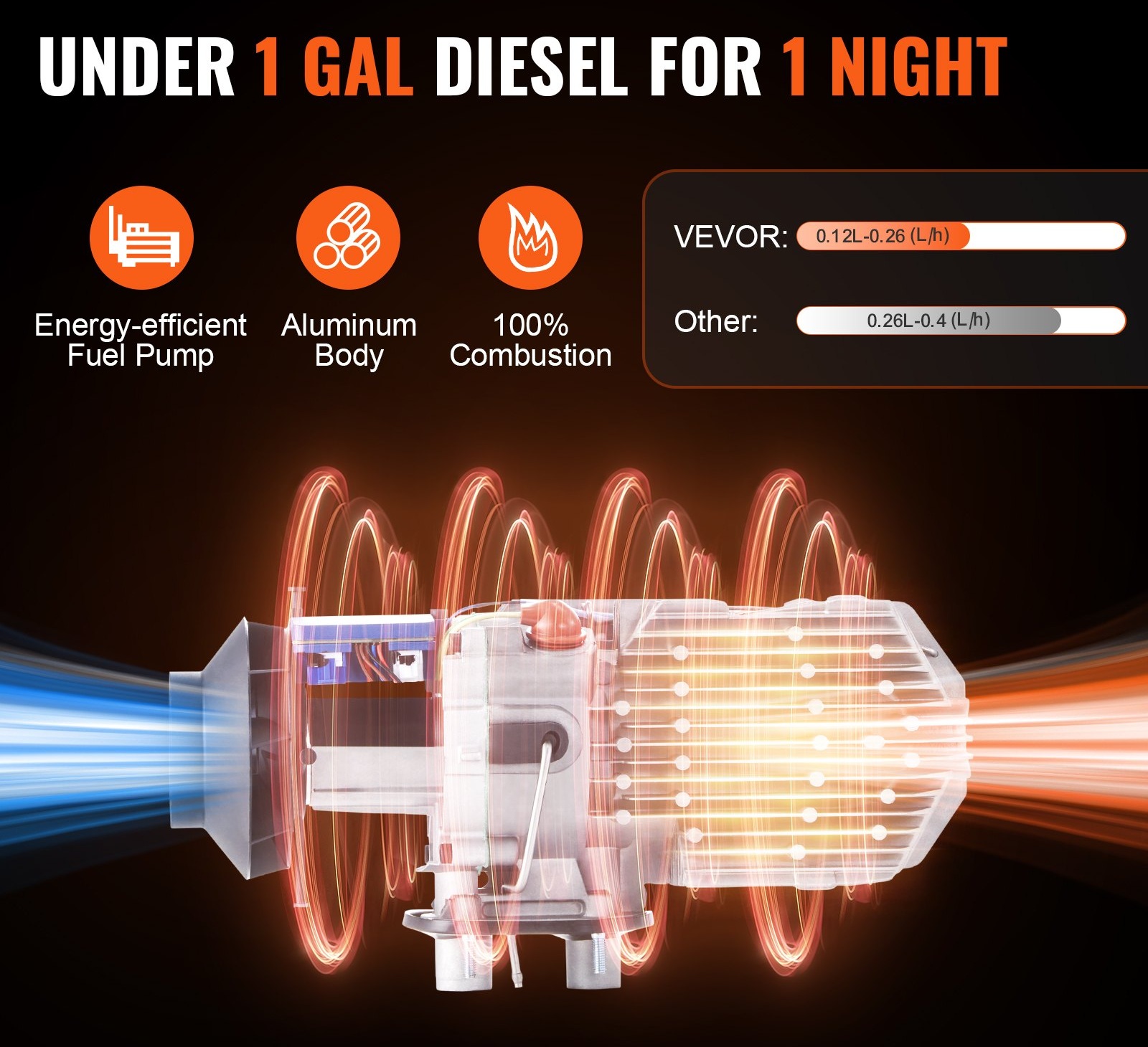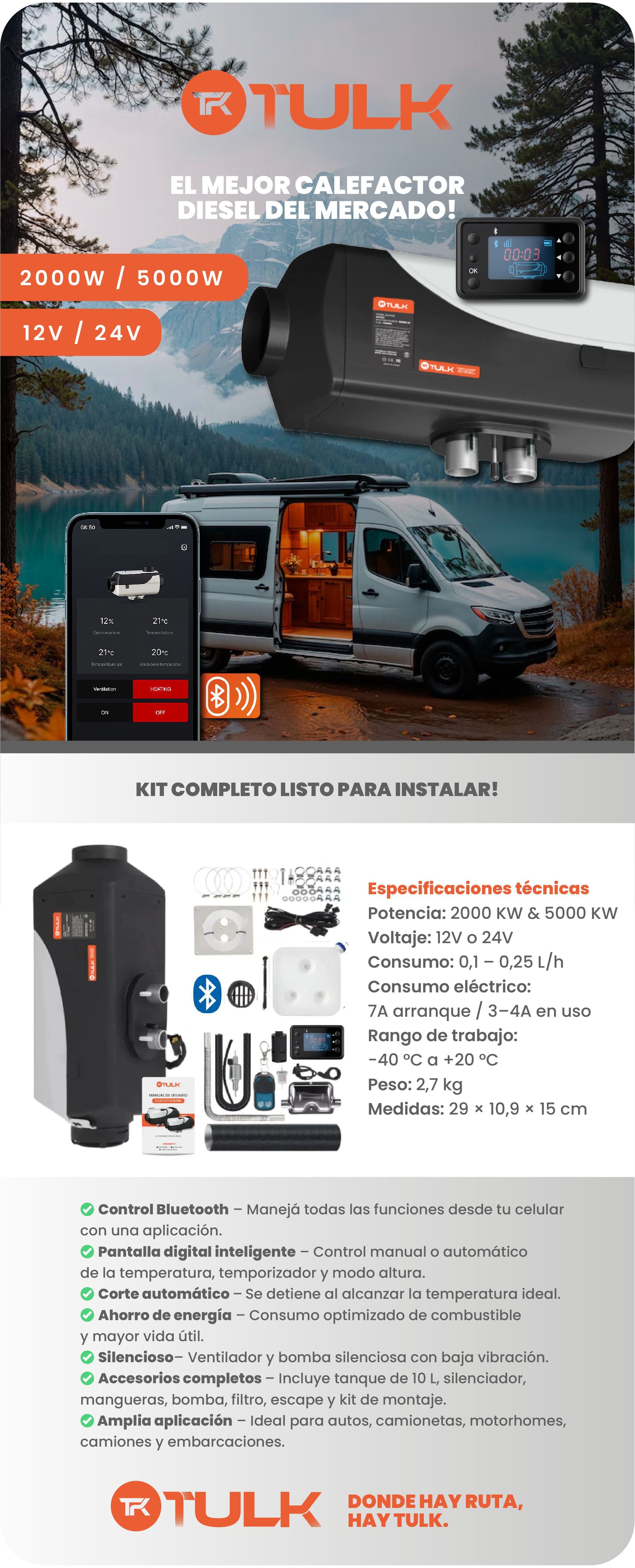 Calefactor / Panel digital / bomba de combustible / manguera de combustible / filtro de combustible / caño de escape /1 tramo de caño de escape / 1 rejilla / caño de admisión / cables / abrazaderas / tornillos.