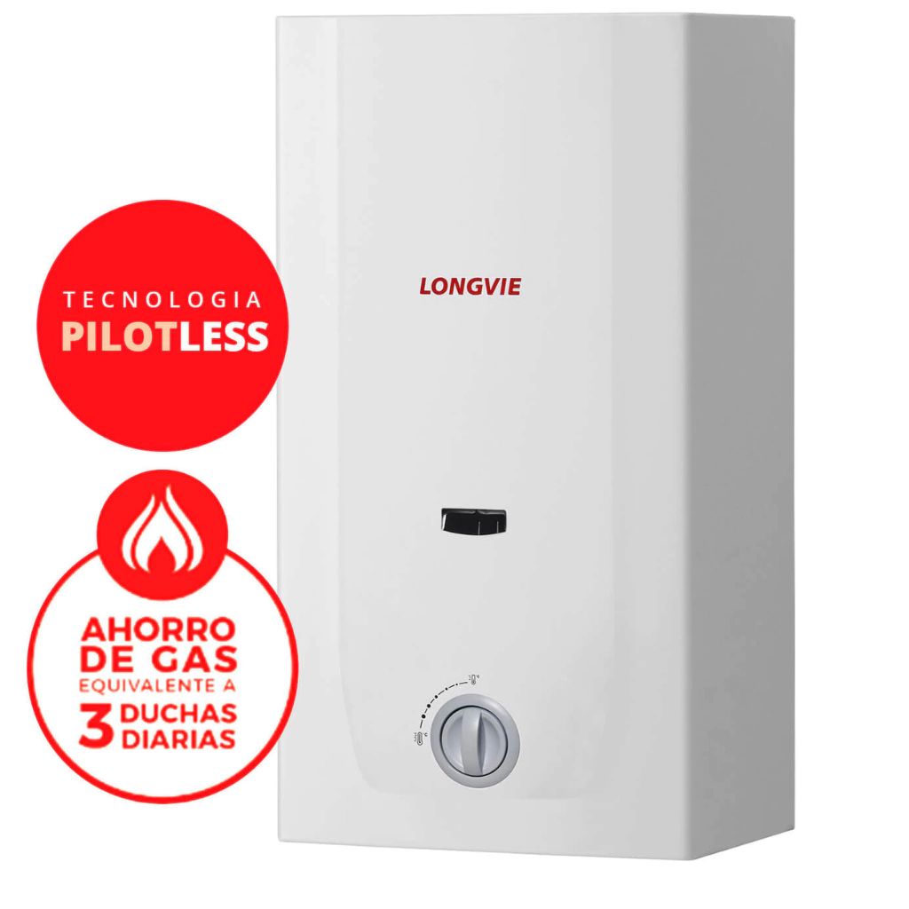 Eficiencia energética ALa ausencia de la llama piloto y la calidad de sus materiales permiten lograr la más alta eficiencia de calentamiento con el máximo ahorro de energía.Tecnología PilotlessSin llama piloto. Evita el consumo de gas innecesario.Ahorro de gasequivalente a3 duchas diariasEncendido electrónico automáticoAl abrir el grifo del agua caliente el calefón se enciende automáticamente, de manera suave e instantánea.Sensor de sobretemperaturaDispositivo de seguridad que evita el sobrecalentamiento del agua y amplía la vida útil del calefón.Sensor de evacuación de gases quemadosDetecta fallas en la salida de los gases de la combustión evitando así la contaminación del ambiente.
