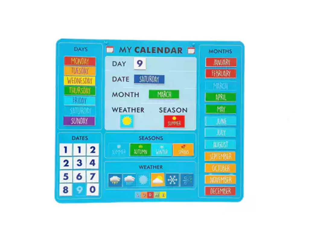 CALENDARIO IMANTADOCalendario imantado en inglés con fichas de 3mm de espesor.Consiste en una placa metálica de 42 x 36cm, con fichas imantadas correspondientes a los días, meses, fecha (número de día), estaciones y clima.El panel tiene referencias visuales para organizar adecuadamente las fichas en orden.La parte posterior es lisa (verde o celeste) y puede utilizarse tanto con fibras para pizarra como con letras, números o cualquier pieza imantada.