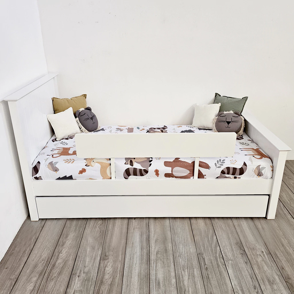 La cama individual Popi con cama carrito es una excelente elección para quienes buscan un mueble funcional y seguro que ofrezca comodidad y durabilidad en el día a día. Su diseño está fabricado en Mdf doble placa de alta calidad con un acabado laqueado atóxico y sus patas y largueros en madera maciza