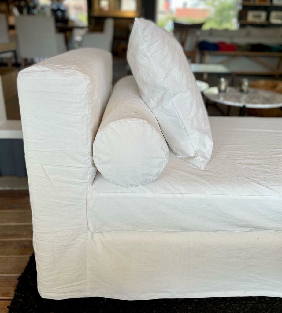 Camastro tapizado en panamá con funda de tussor. Incluye 4 almohadones: 2 circulares y 2 rectangulares.Medidas: 1.70x0.70 metros.Altura asiento: 45 cmAltura respaldo: 75 cm