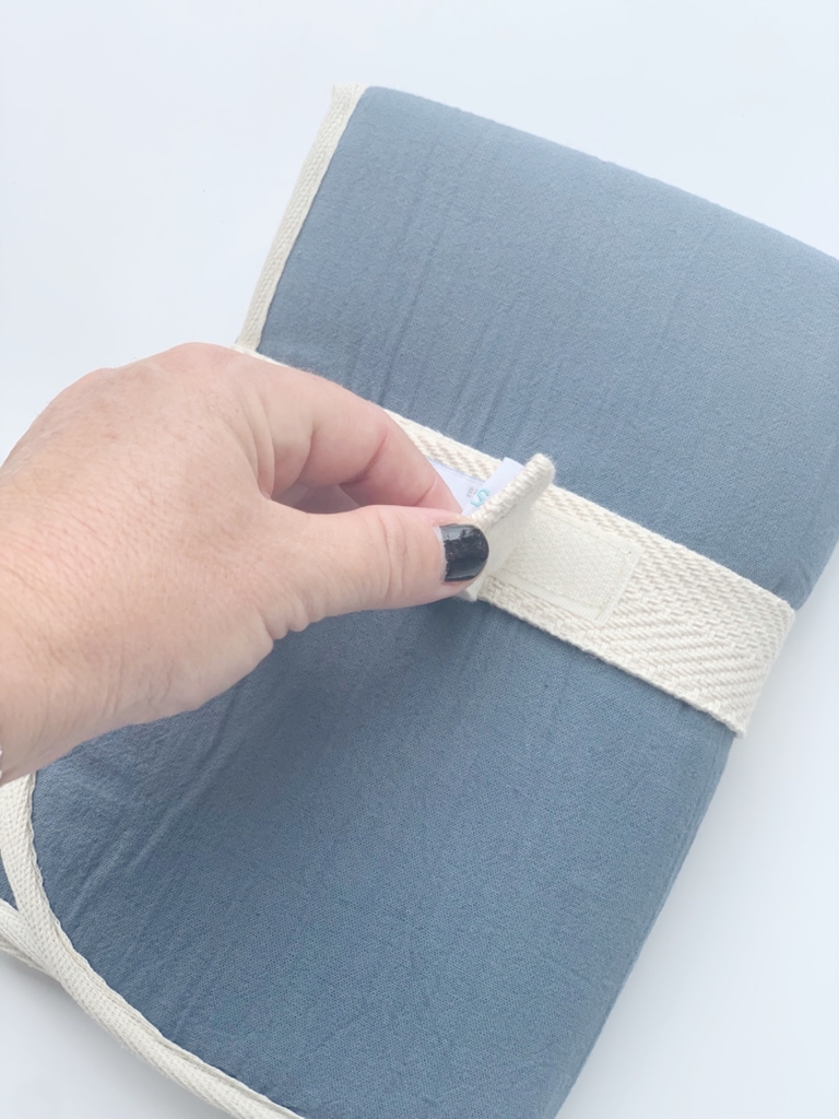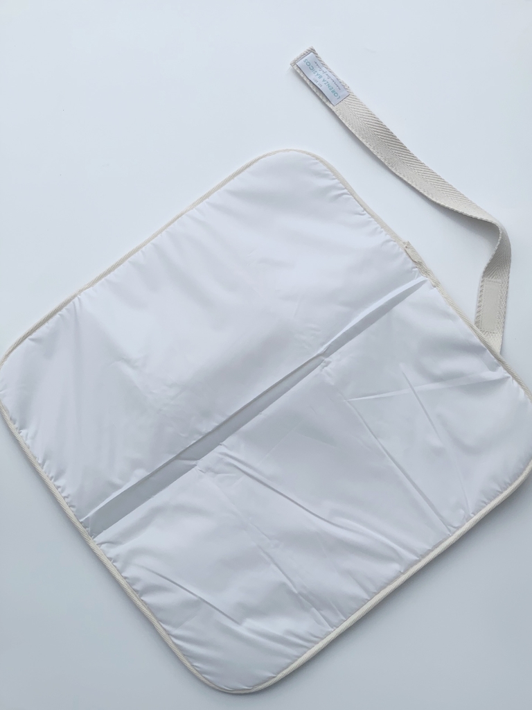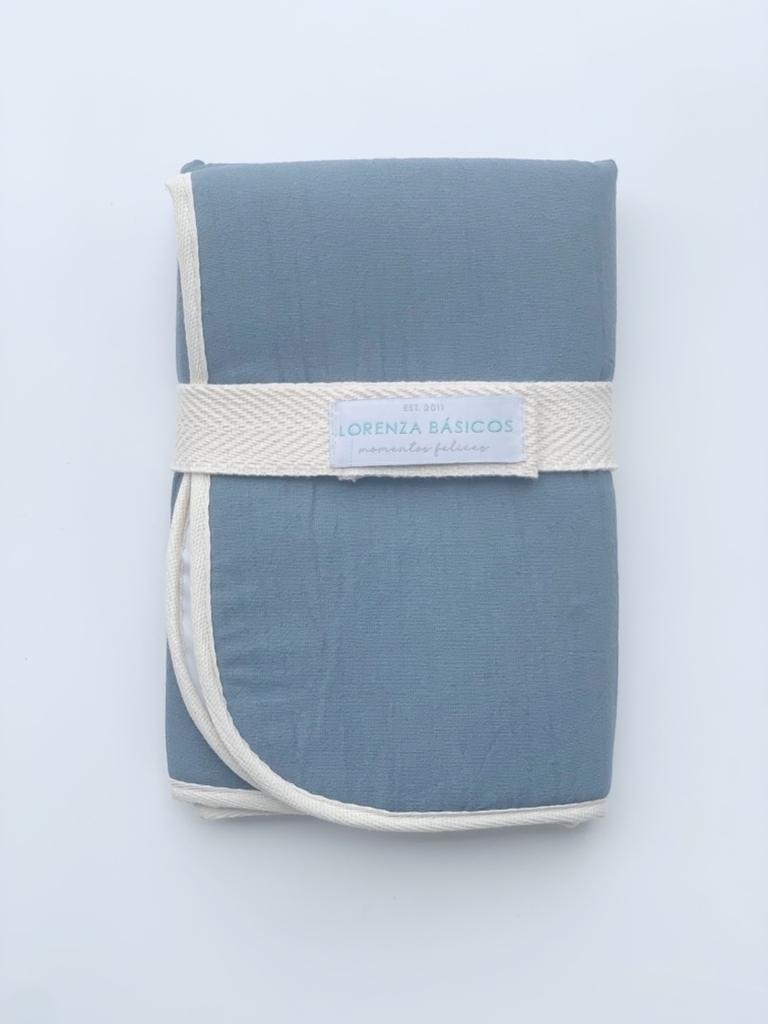 El exterior es de tusor liso y el interior es de tela impermeable muy fácil de limpiar que no se rompe, no se mancha y evita que el bebé se pegotee. Se cierra con una cinta con velcro.