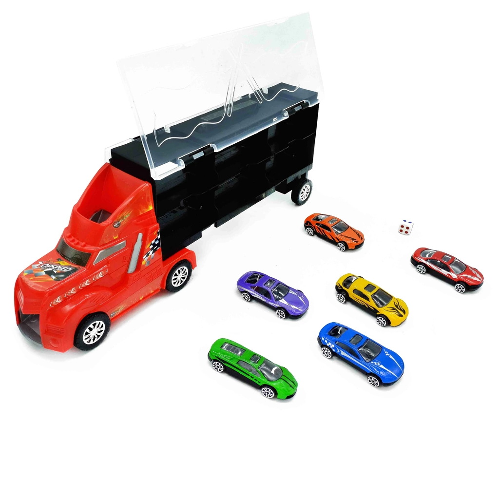Camión transportador de autos. Con 6 autos metálicos. Incluye tablero para juego de mesa, lanzando el dado comienza a avanzar, el primero que llegue a la terminal es el ganador.Los costados del camión se despliegan para poder colocar todos los vehículos, funcionando como un espacio de almacenamiento. Liviano y fácil de transportar. Los autos pueden lanzarse desde la cabina del camión hacia delante. Escala 1:35.Material: Plástico resistente.Para niños mayores de 3 años. Permite el desarrollo cognitivo, la coordinación óculo-manual, desarrollo motriz, desarrollo de la concentración, interacción entre los niños, estimula la imaginación, la comunicación y la capacidad de pensamiento. Desarrolla la curiosidad en los niños para recrear escenas de la vida cotidiana, fomentar la estimulación la coordinación del niño.En caja. NO utiliza pilas.Medidas del camión: 36 cm (largo) x 13 cm (alto) x 7 cm (prof.)Medidas de la caja: 38 cm (largo) x 14 cm (alto) x 8 (prof.)Medidas del Tablero: 50 cm (ancho) x 50 cm (alto)