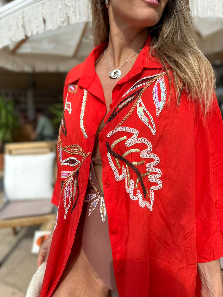 Blusa oversize confeccionada en viscosa. El frente presenta bordados de hilo con apliques de lentejuelas en dorado y crudo y ocre, hecho 100% a mano por artesanos. Las mangas son 3/4, hasta el codo.