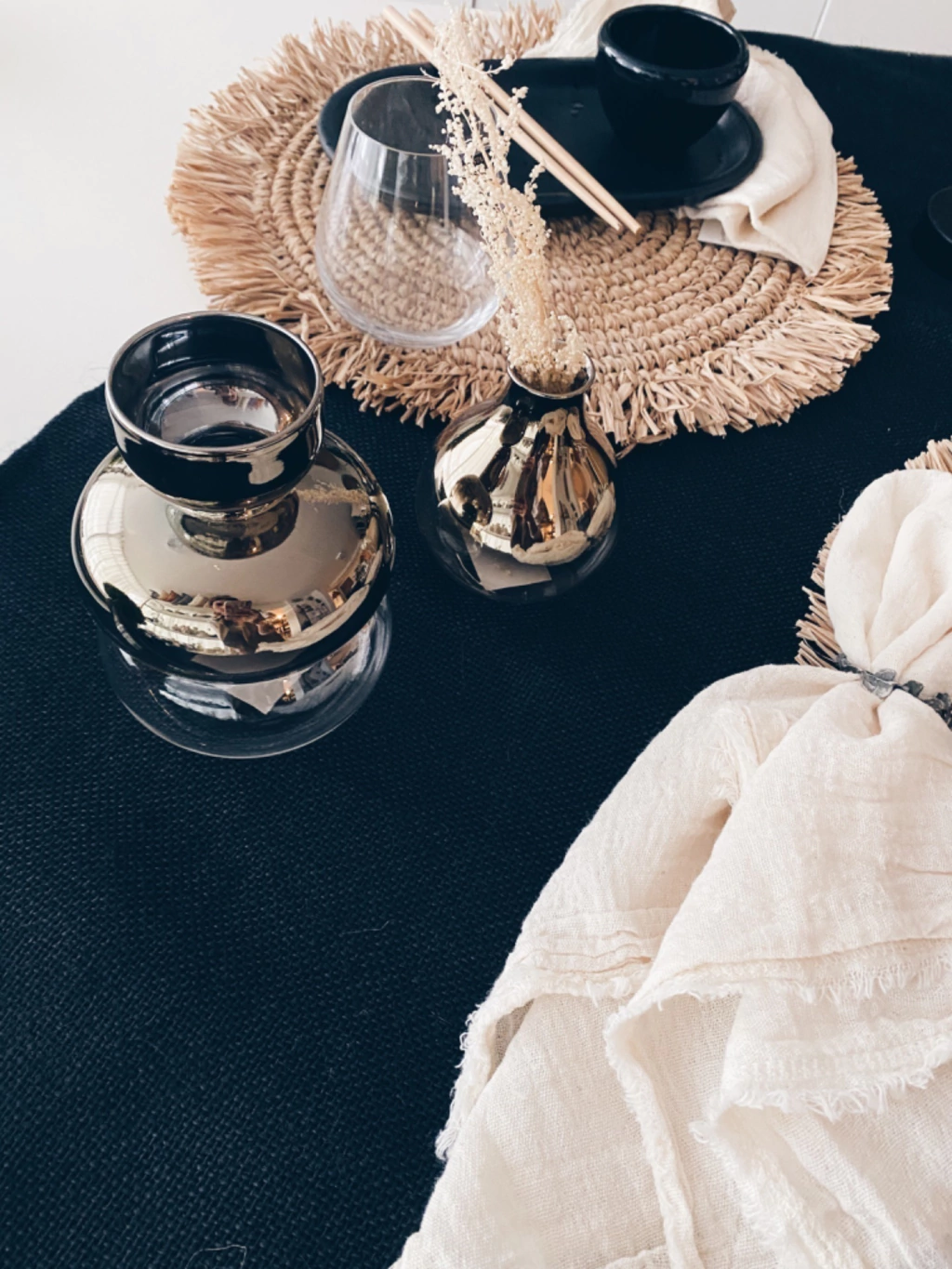 Camino de hilo de yute teñido negro, con terminación de flecos con nudos en ambas cabeceras.divino para combinar con individuales arpillera y platos de sitio de papel.Disponible en dos medidas;2.50m x 0.45m3.00m x 0.45m