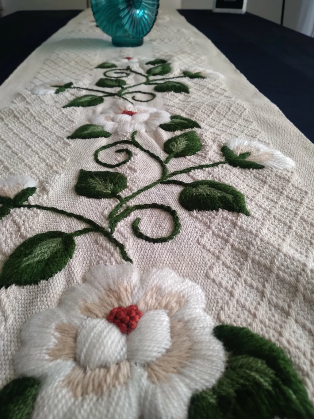 Dale un toque único y calido a tu mesa con nuestro Camino de mesa bordado a mano. Hecho con materiales de alta calidad, como el picote de algodón y la lana de oveja, este camino es perfecto para quienes valoran la artesanía y el diseño exclusivo.