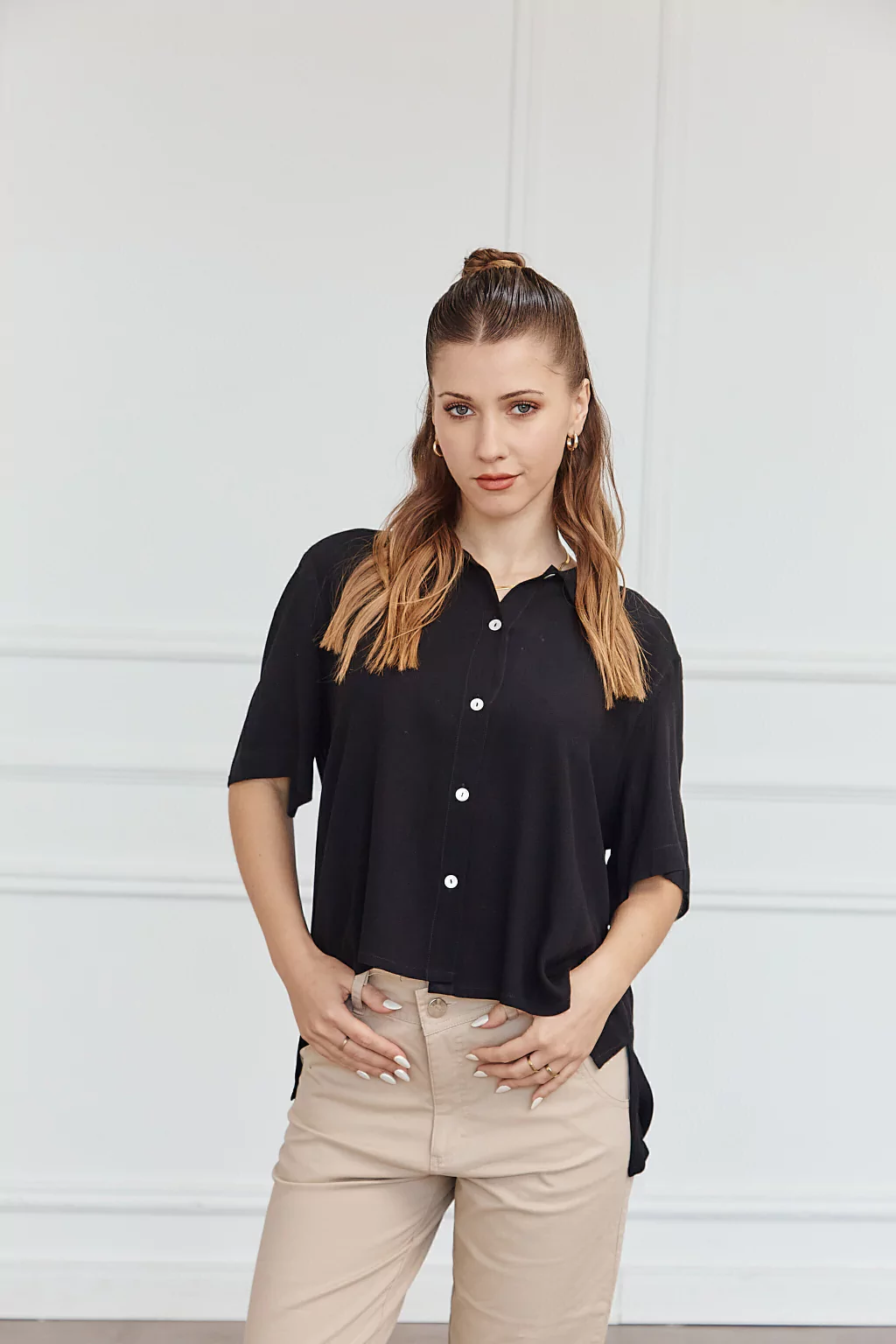 Camisa holgada de crepe, mangas cortas con botones de nacarComposición: 96% rayon - 4% spandex.TABLA DE MEDIDAS: