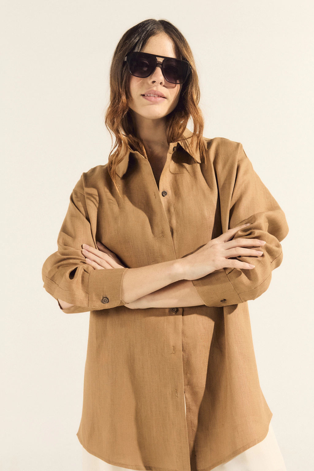 Camisa de lino de corte clásico un poco más larga, estilo oversize.