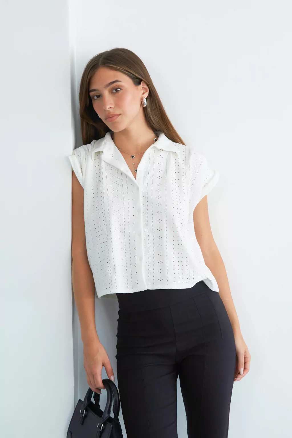 CAMISA DE BRODERIE CON LYCRA MANGA CORTA CON PINZA EN LOS HOMBROS Y EN LA ESPALDA