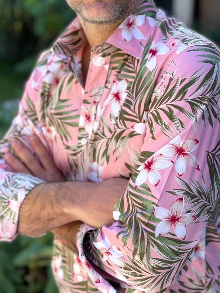 COLOR: Poplin estampada fondo rosa estampada con flores y hojas en verdes, beige, crudo, rosa, fucsia