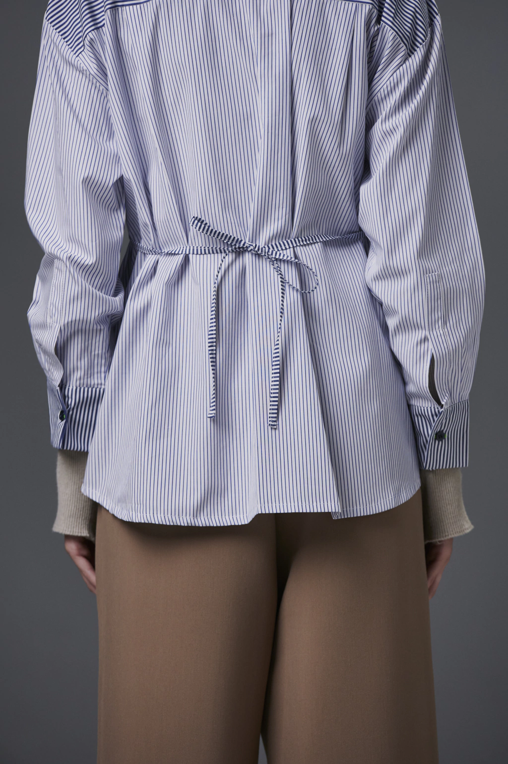 Camisa de Poplin de Algodón. De silueta cómoda con mezcla de dos tipos de rayados. Botones de nácar a tono. Detalle de ojal en cuello y puós en tono lima. Bordado en color lima al frente. Posee tiras del mismo textil para anudar.