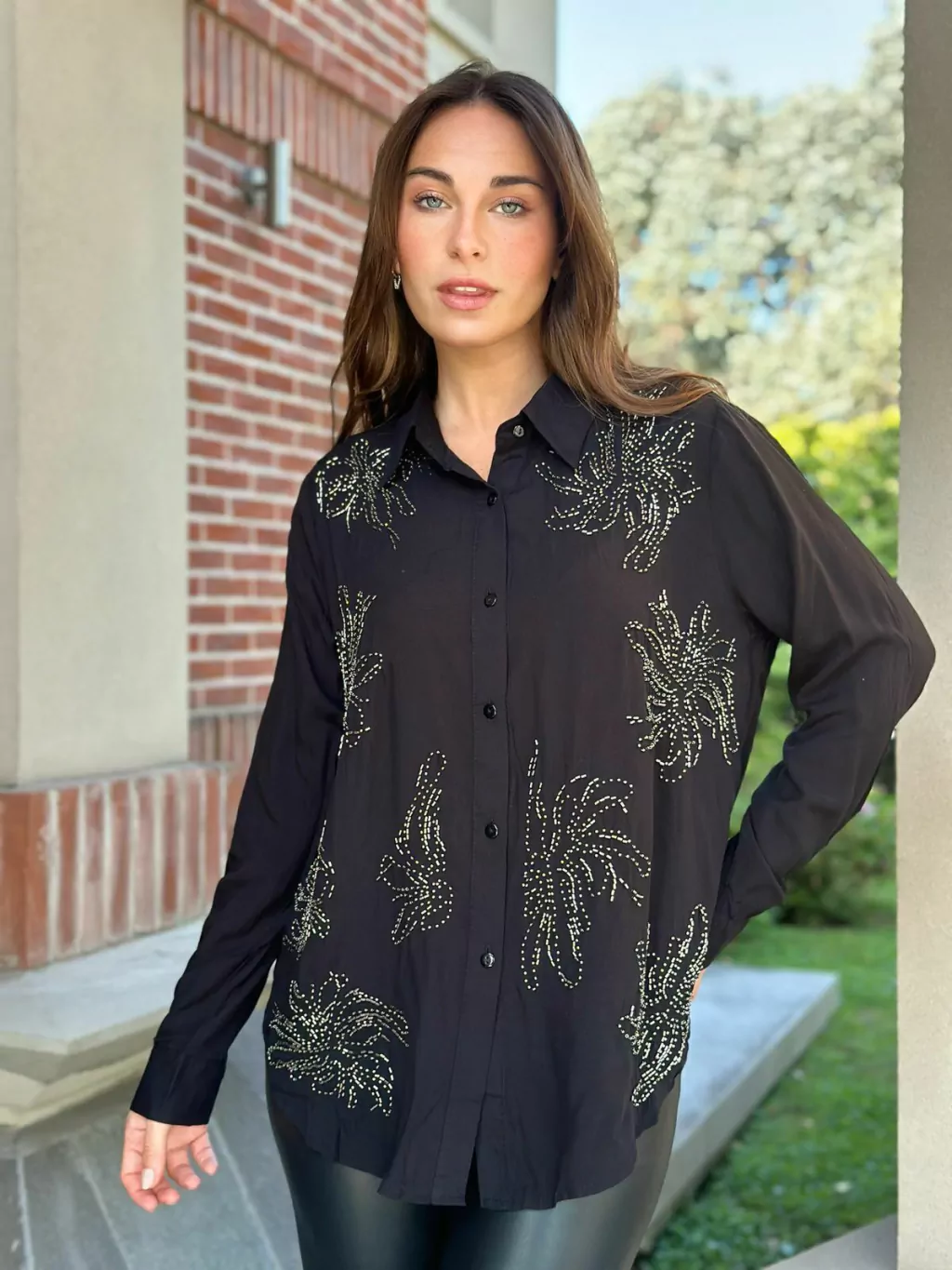 Camisa Premium de Fibrana con Aplique Canutillos. Medidas Aproximadas: Talle M Sisa 56 cm Largo 70 cm, Talle L Sisa 58 cm Largo 72 cm y Talle XL Sisa 60 cm Largo 72 cm.
