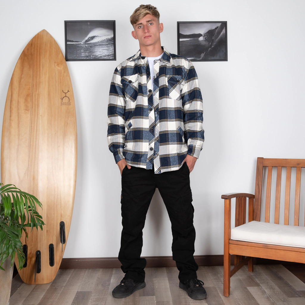 Camisaco en viyela escocesa pesada , forrado con corderito y abrigo en las mangas. Corte de camisa leñadora con dos bolsillos inferiores ojal y dos superiores plaqué. Costuras reforzadas contando con la seguridad en nuestras prendas. Decorado con multietiquetas tejidas.