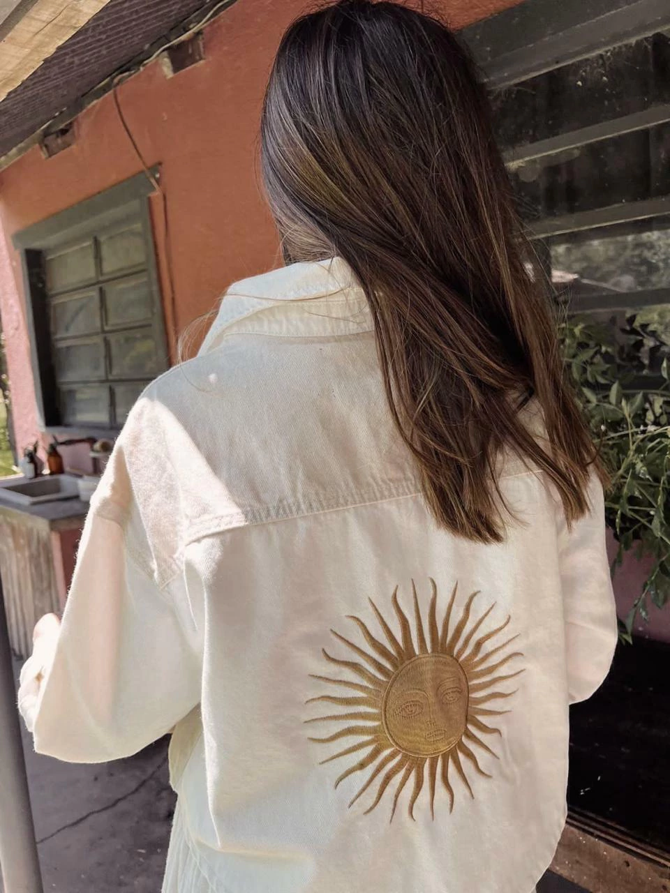 IMPORTANTE: LA IMAGEN ES UNA MUESTRA A MODO DE REFERENCIA. CONFECCIONADAS EN DENIM PRE LAVADO, COLOR CLARO COMBINADA EN DOS TONOS. CON SOL BORDADO EN LA ESPALDA. MODELO CORTO.