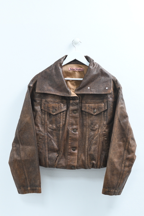 Campera oversize de denim engomada. Tono marrón oscuro con efecto gastado. Cuello solapa con cartera y botones de metal a tono. Cuatro bolsillos. Forro beige. Efecto bolsa en ruedo. Medidas - Ancho de hombros: 52 cm. Contorno de pecho: 108 cm. Largo total: 50 cm.Marca:Acne StudiosComposición:100% AlgodónEstado:Excelente¿Tenés dudas con el talle? Seguí nuestras recomendacioneshttps://www.tiendacocoliche.com/guia-de-talles/
