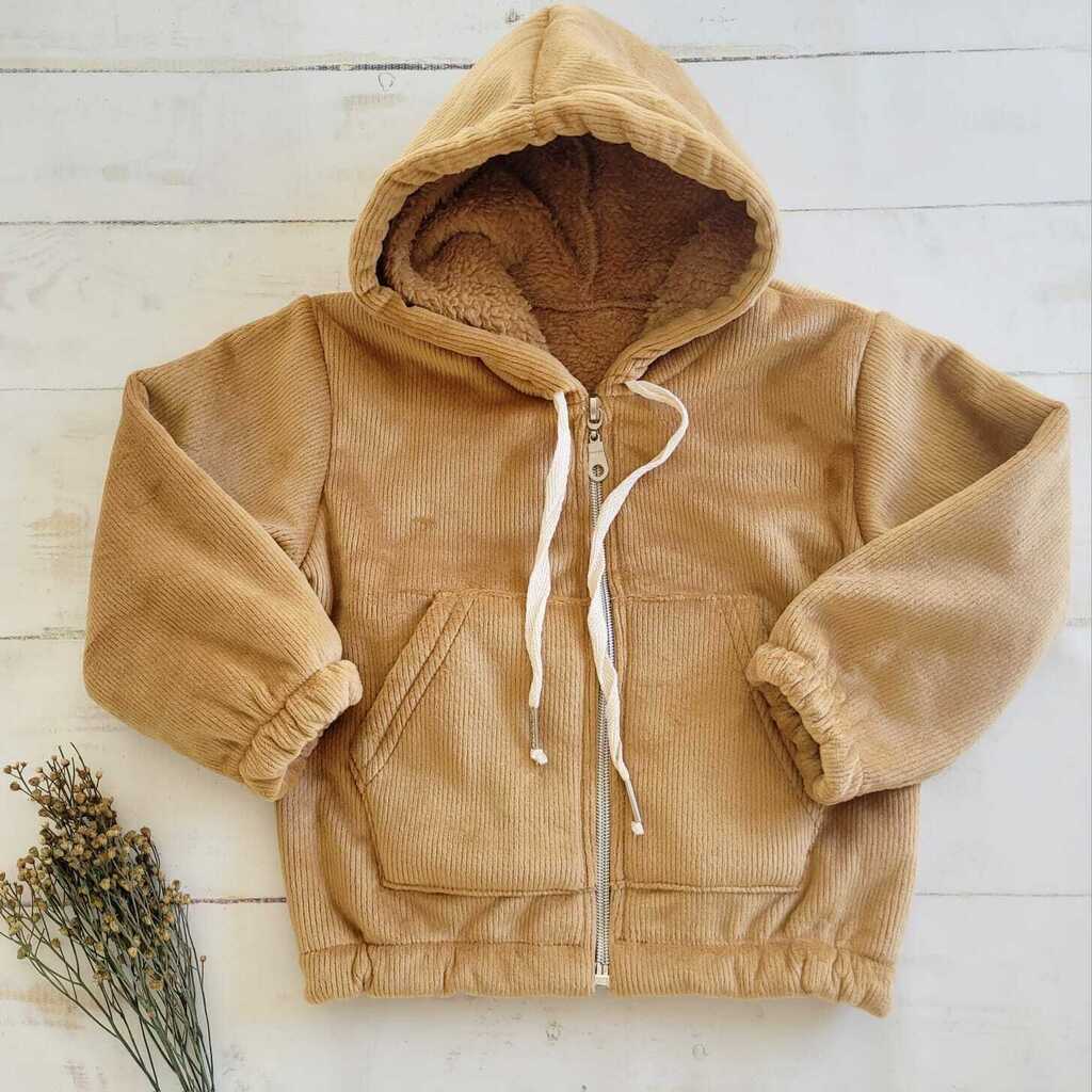 Campera de corderoy forrada integramente con corderito. Tiene capucha y bolsillos. Es realmente un hermosa muy suave al tacto y confeccionada en una tela con spandex para darle mayor comidad a los mas chiquitos.