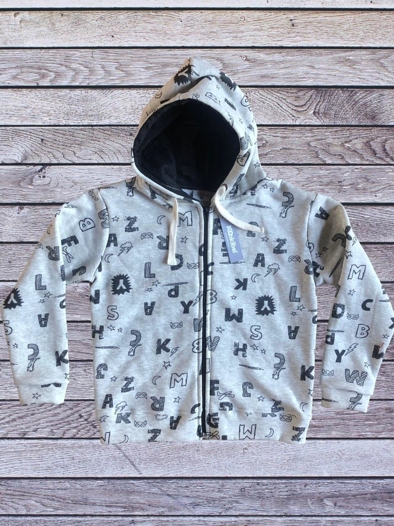 Campera de frisa estampada, con capucha forrada en jersey negro haciendo juego con la estampa y cordón ajustable en la capucha.