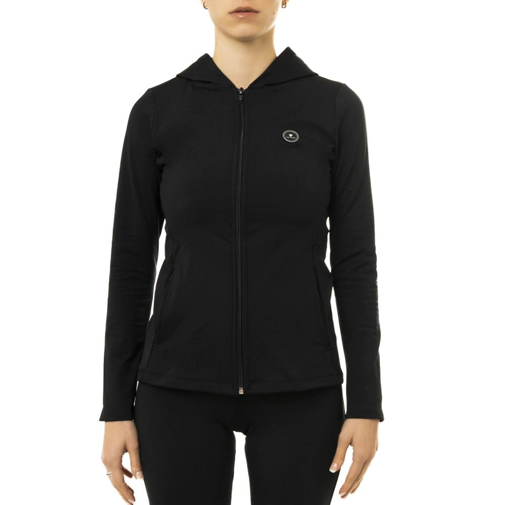 Campera deportiva con capucha confeccionada en polisap frizado, un material flexible y abrigado que se adapta al cuerpo sin limitar el movimiento.