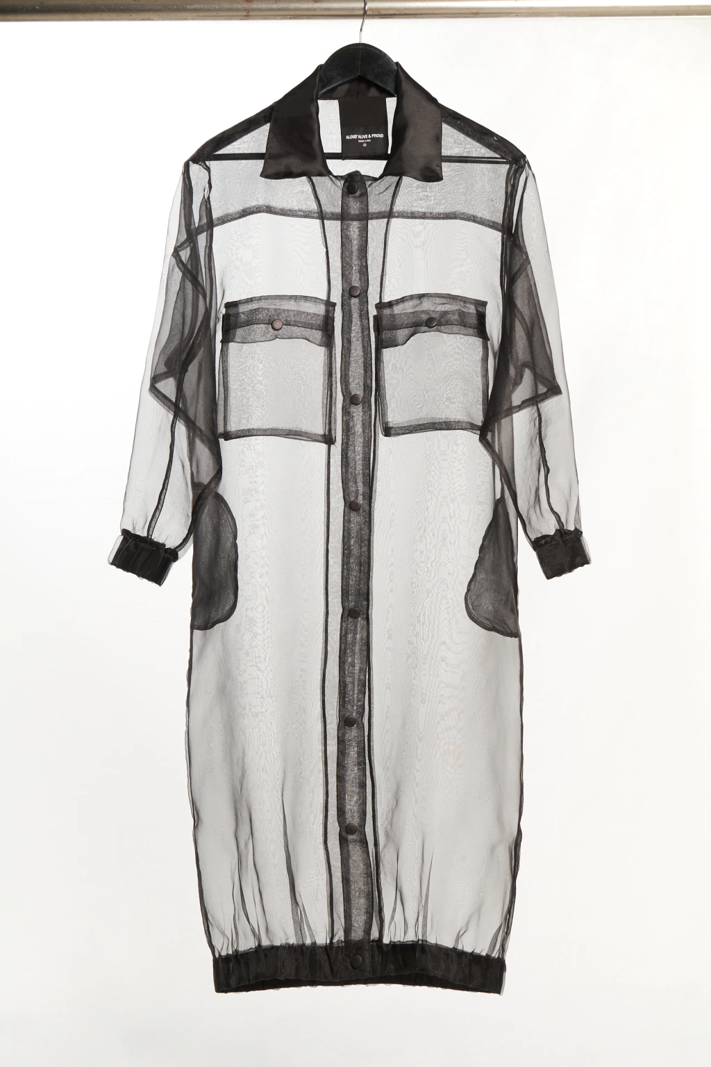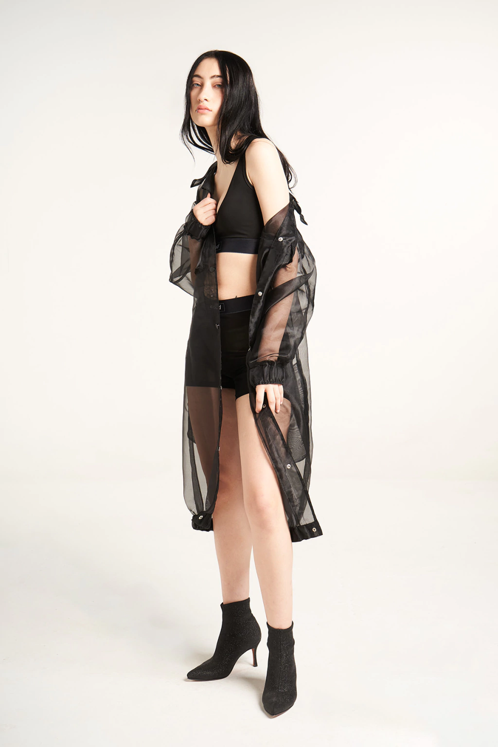 DescripciónCampera de Organza negra talle único, larga hasta las rodillas, con botones a presión. Elástico en ambos puños y terminación. Dos bolsillos frontales a presión negros y dos bolsillos laterales.