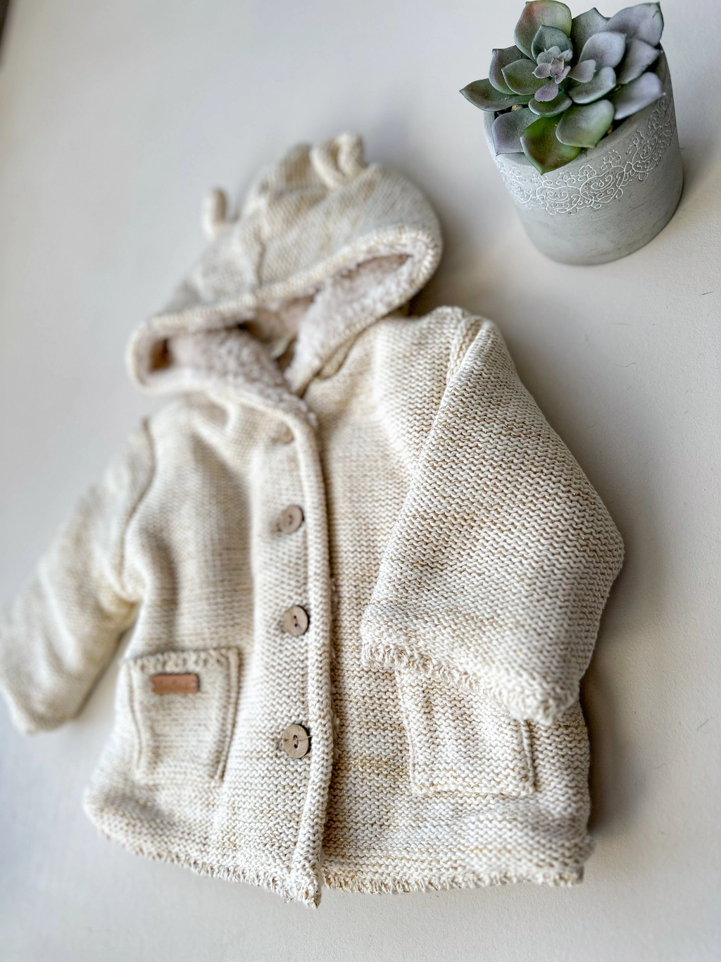 Campera TeddyCamperita tejida en hilo de algodon, forrada completamente con piel. Capucha con orejitas de oso y botones de coco.Vienen en dos colores, tostado y natural con lurex (hilos dorados)