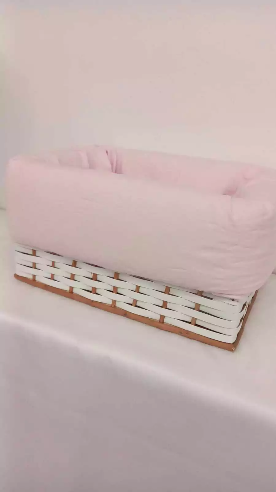 Canasta de mimbre sintetico relleno de guata y forrado en tela TusorLa tela se puede desmontar sin la guata para lavar ya que viene con elasticos en los bordesIdeal para guardar las cositas del bebe