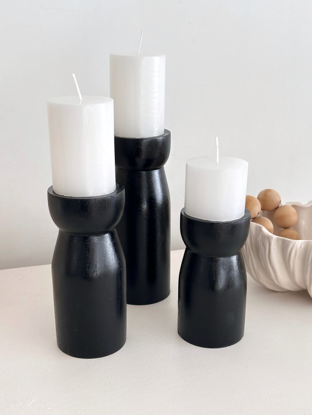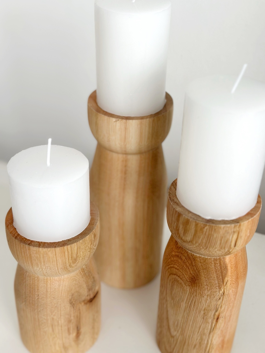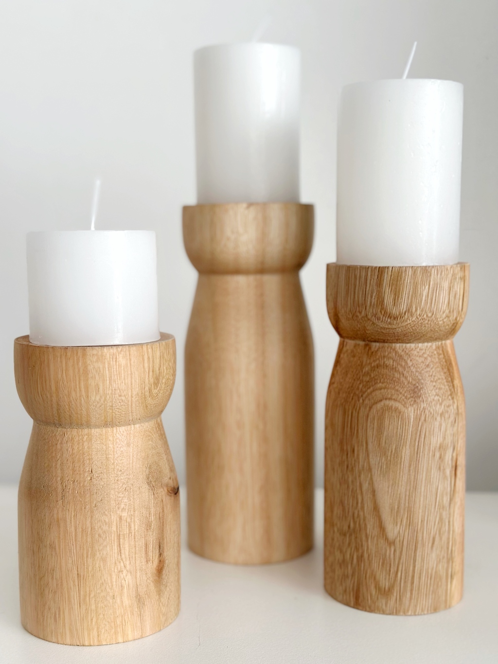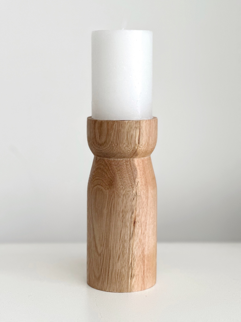 Candelabro / Porta vela de madera maciza torneada con velón blanco.