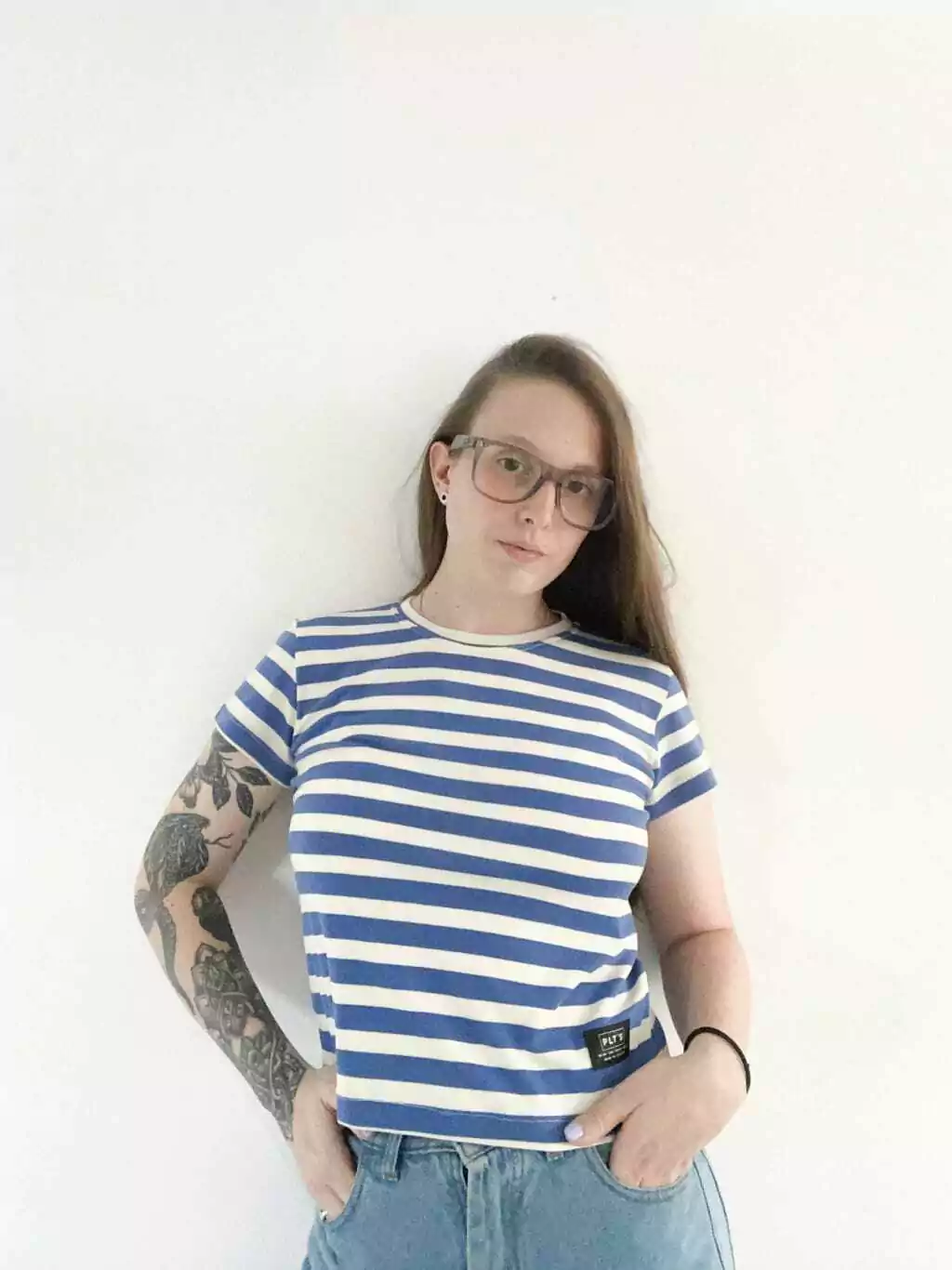 Remera crop azul con rayas blancas.Modal softComposición: 95% viscosa poliester 5% elastanoPodés comparar estas medidas con alguna prenda que tengas o podes tomar tus medidas con un centimetroLA MODELO USA TALLE UNO
