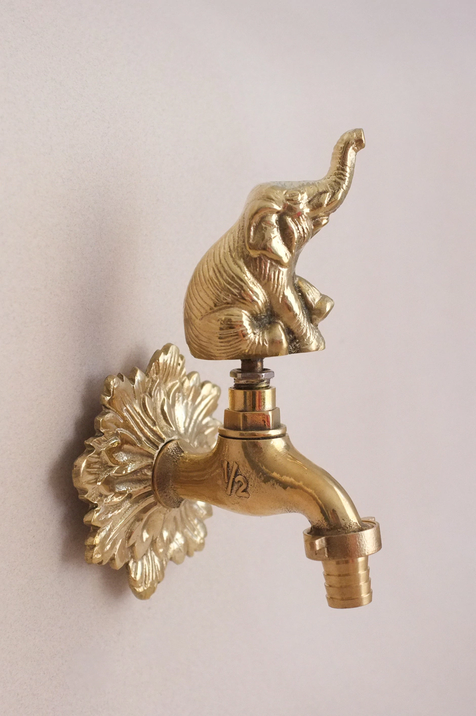 Canilla de exterior con diseño elefante fabricado en bronce pulido con laca.