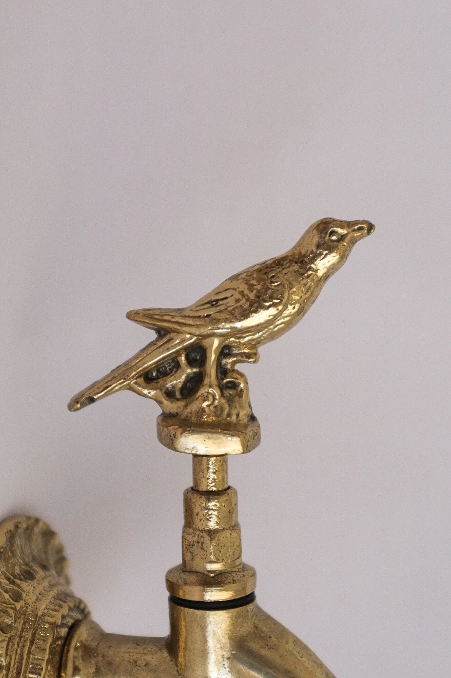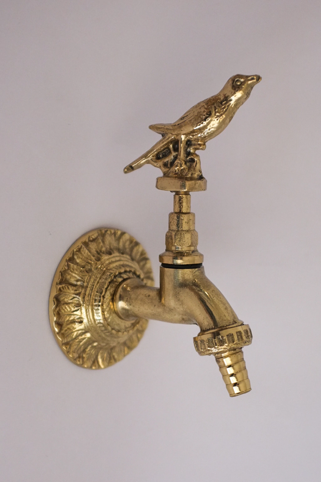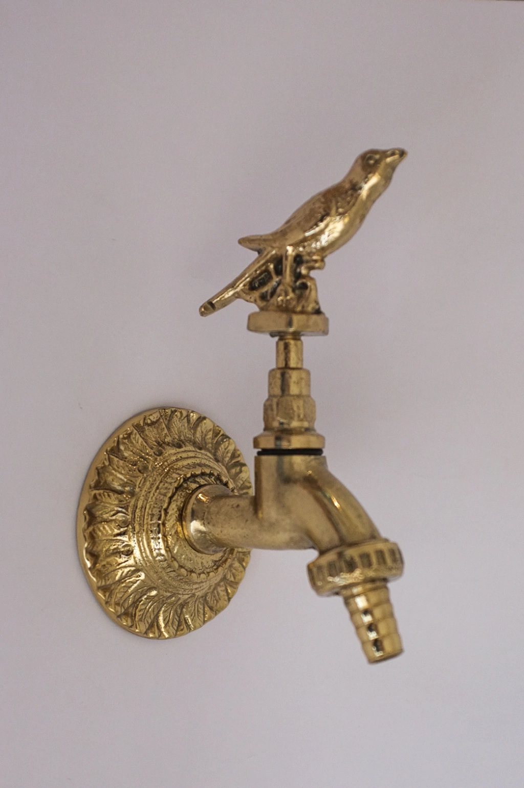 Canilla de exterior con diseño pajarito en bronce pulido con laca, roseta de estilo y pico para manguera.Canilla 1/2 pulgadaMEDIDAS:Roseta base: 8,5 cmAltura total: 18 cmProfundidad: 11 cm