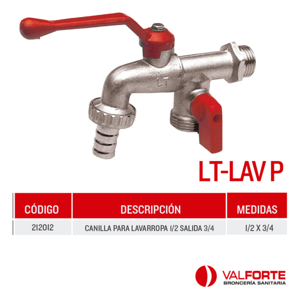 Características- Marca: LATYN TRADE.- Linea: VALFORTE.- Modelo: LT-LAV P.- Canilla Doble Esferica para Conexion Lavarropa.- Diametro Conexion Pared 1/2 pulgada.- Diametro Conexion Lavarropa 3/4 pulgada.- Cuerpo, bonete y bola de Bronce Cromado.- Asiento de Bola de P.T.F.E.- Manija Palanca de aluminio Pintada (Rojo).