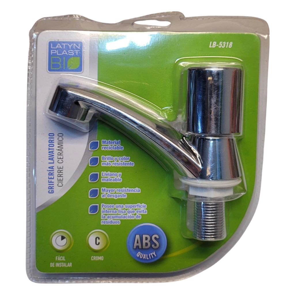 Características- Marca: LATYN TRADE.- Linea: Latyn Plast BIO.- Modelo: LB-5318.- Canilla Plastica ABS Cromada 1 Agua.- Para lavatorio 1 agujero (Baño/Lavadero/Jardin).- Volante Redondo.- Color Cromado.- Pico incluye Aireador (Cortachorro).- Diametro Conexion 1/2 pulgada.- Largo rosca 4cm.- Cierre Ceramico (1/4 de vuelta).- Ancho 13cm - Alto 7cm.- Incluye 2 Arandelas de Goma y 1 Tuerca de colocacion.- Material Reciclable.