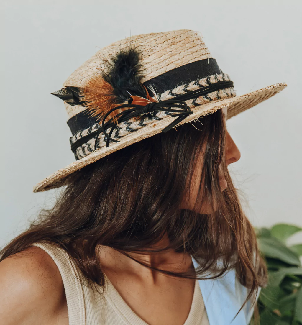 Canotier de rafia natural.Con cintas y plumas importadas.Cinta interior para ajustar el talle.