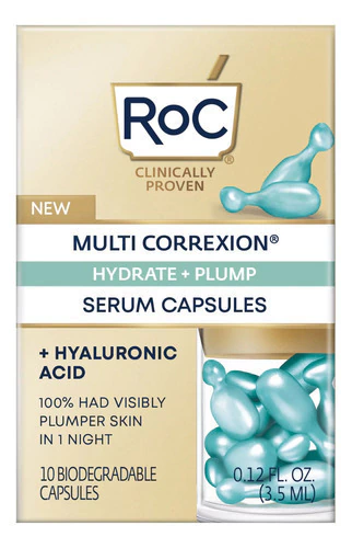 Roc - Capsulas de Acido Hyaluronico- 10 Capsulas- Descubra las cápsulas de suero Hydrate + Plump de RoC clínicamente probadas, con nuestro ácido hialurónico de acción más rápida. En solo 1 noche, el 100 % de las mujeres tenían una piel visiblemente más tersa. Después de 1 semana, el 100 % había reducido visiblemente las líneas de expresión y las arrugas y los niveles de hidratación de la piel se duplicaron.- Estas cápsulas contienen una dosis perfectamente medida de ácido hialurónico, que se ha demostrado que atrae la humedad desde el interior de la piel hacia la superficie para obtener el máximo poder de relleno. Nuestras cápsulas 100% biodegradables están herméticamente selladas para una frescura óptima y un uso fácil sobre la marcha.- Producto hecho en ItaliaVencimiento: 12 meses luego del primer uso ** Publicado utilizando Astroselling **