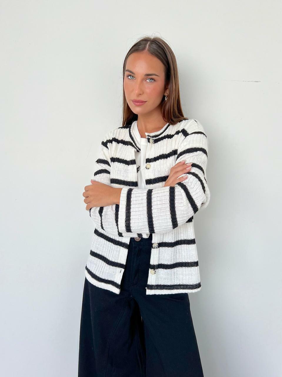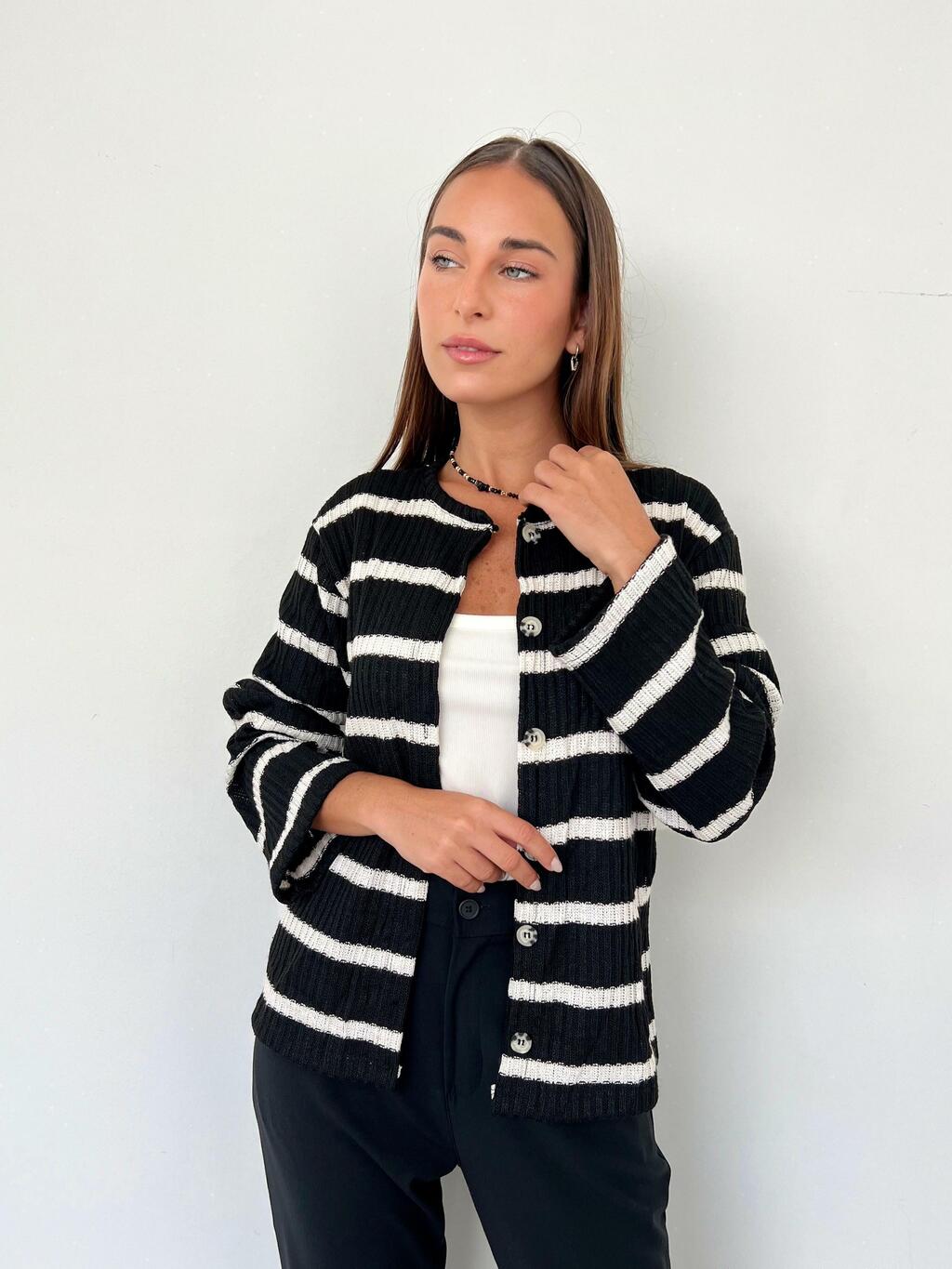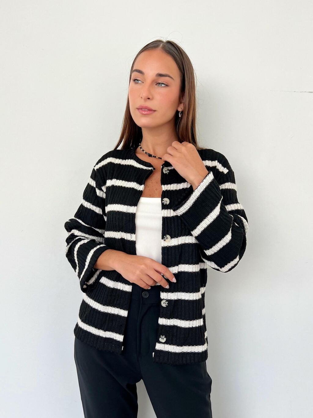 El cardigan Nagora esta confeccionado en tejido liviano, calce regular y largo modular a la cadera. El diferencial de esta prenda son las rayas que le generan mucha onda y sus botones marmolados a contra tono. Combinalo con tu denim preferido y hace tu look descontracturado!