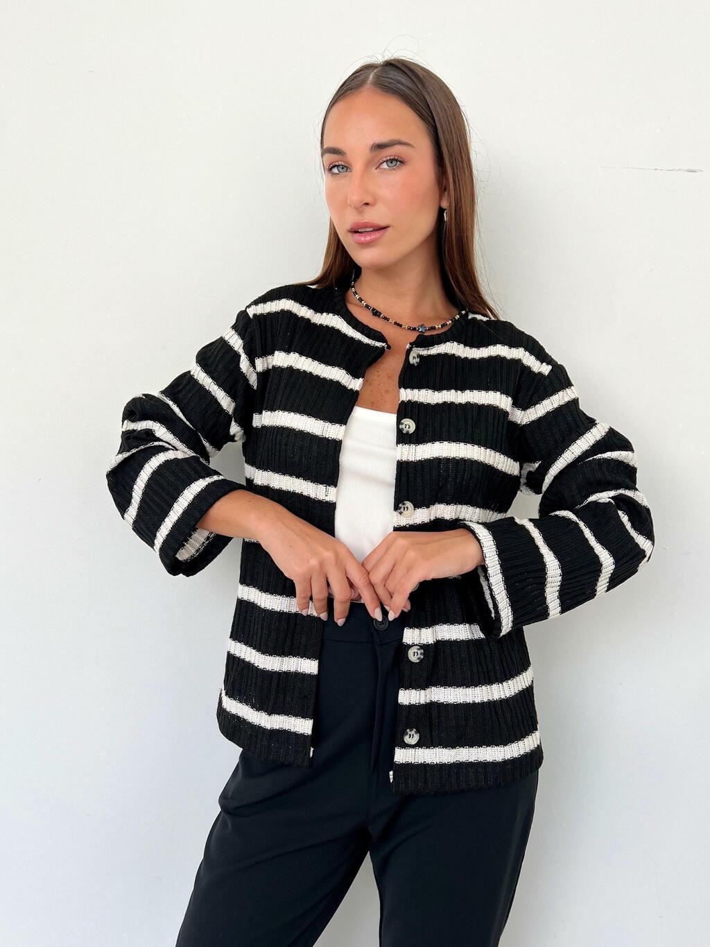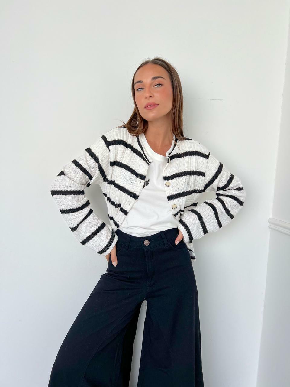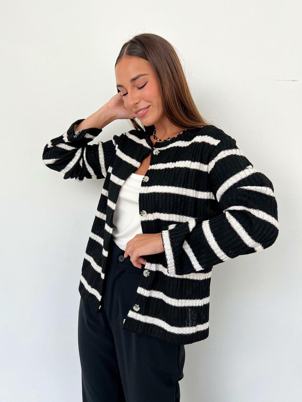 El cardigan Nagora esta confeccionado en tejido liviano, calce regular y largo modular a la cadera. El diferencial de esta prenda son las rayas que le generan mucha onda y sus botones marmolados a contra tono. Combinalo con tu denim preferido y hace tu look descontracturado!