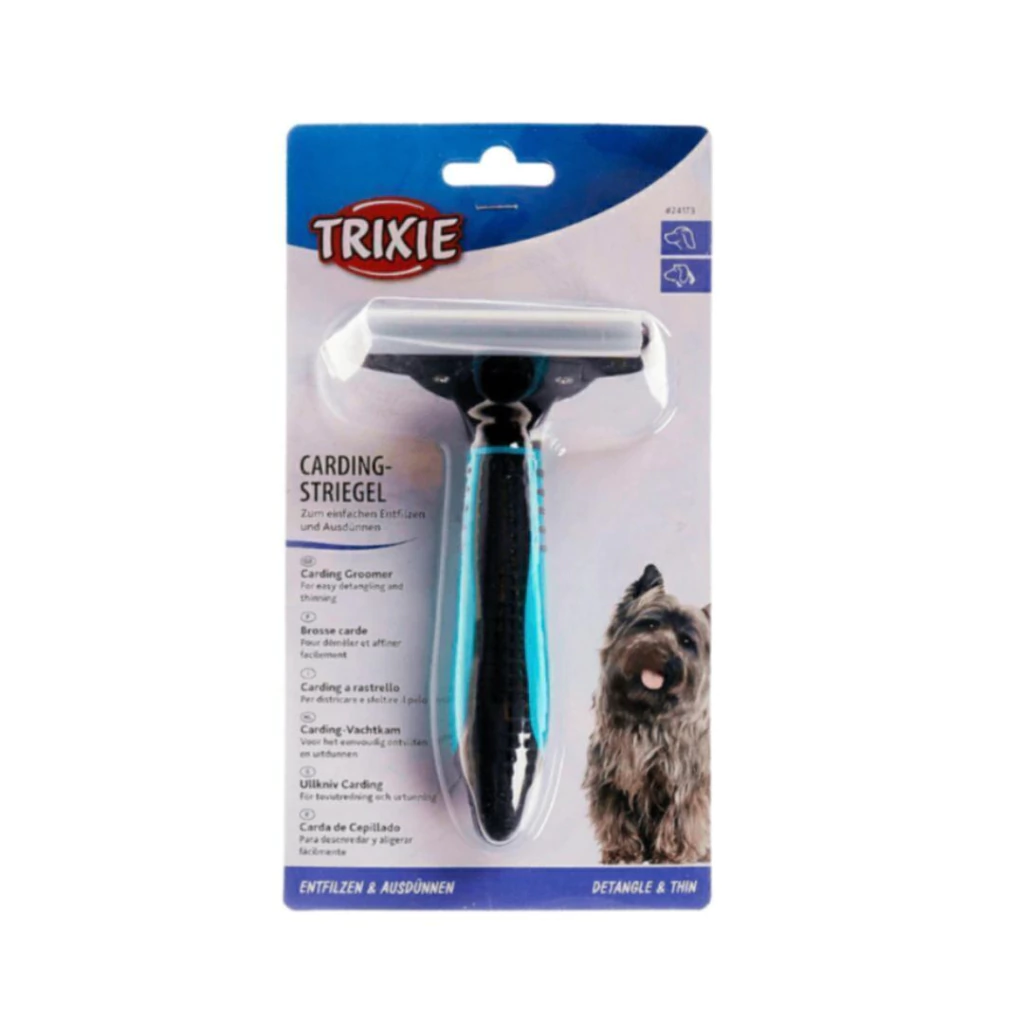 Cardina Cepillo Trixie para Perros de Pelaje Corto y Largo Removedor de Pelo S-MMarca:TrixieMedidas:7 × 15 cmColor:Negro y AzulIdeal para:Perros Medianos y Pequeños de Pelaje Corto y LargoCaracterísticas:Elimina el pelo muerto.Para desenredar y aligerar fácilmente.Repuestos para la cuchilla que se cambian fácilmente por el mecanismo del mango.Cuchilla de acero inoxidable.Manija de plástico con agarre antideslizante de goma.También apto para caballos