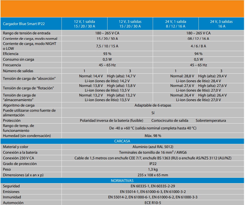 El cargador Blue Smart dispone de gestión «adaptativa» de la batería controlada por microprocesador. Su función “adaptativa” optimizará automáticamente el proceso de carga en base al uso que se le dé a la batería.