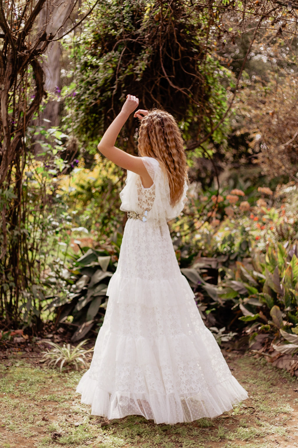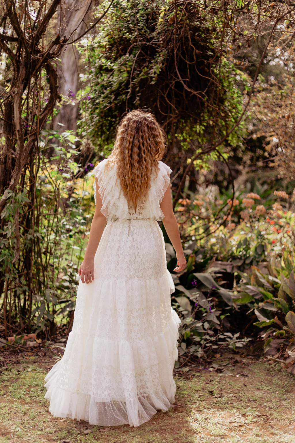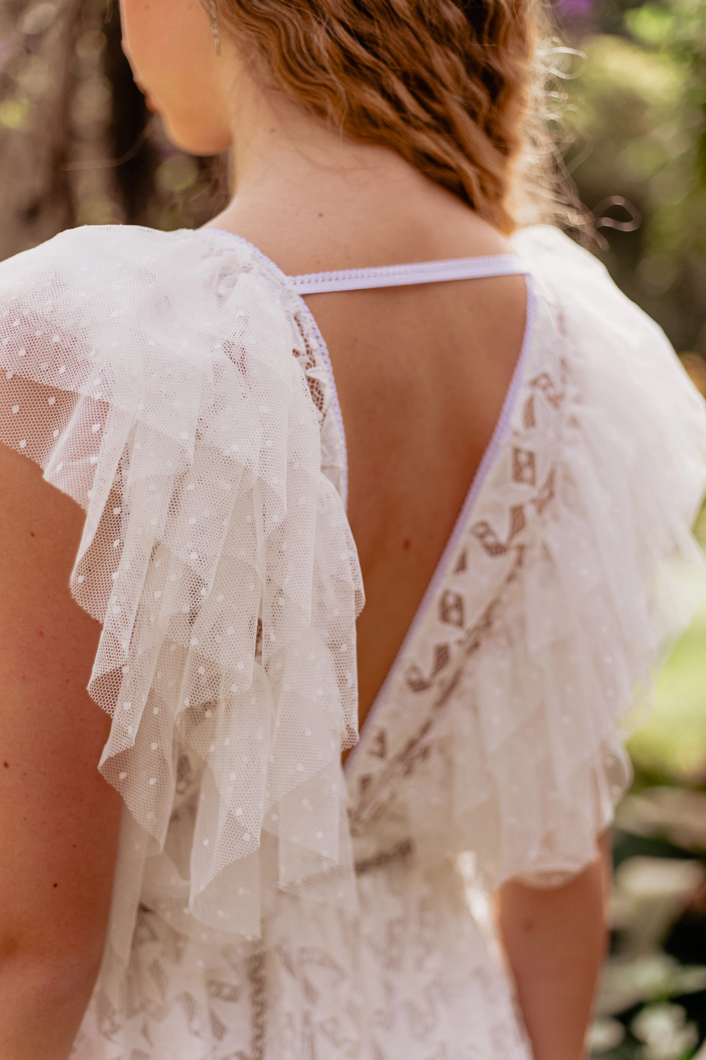 Este vestido presenta un escote en V tanto en el frente como en la espalda, adornado con delicados voladitos que añaden un toque de romance y encanto a la vez. El encaje de estrellas en contraste con el plumetí blanco crea un efecto visual deslumbrante.