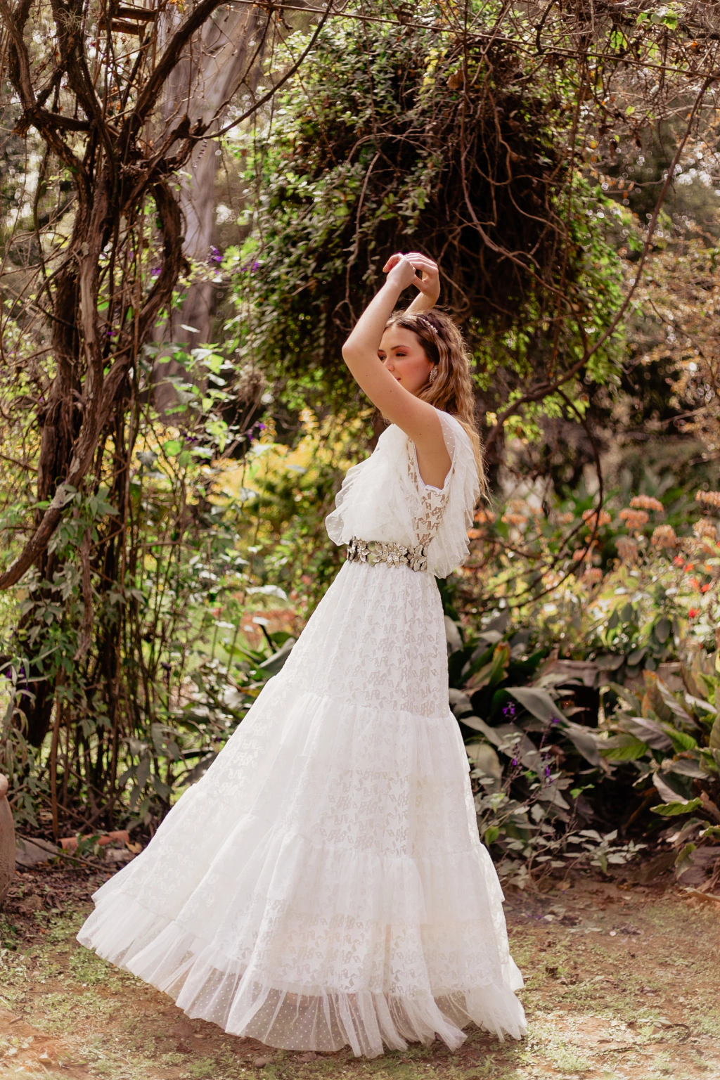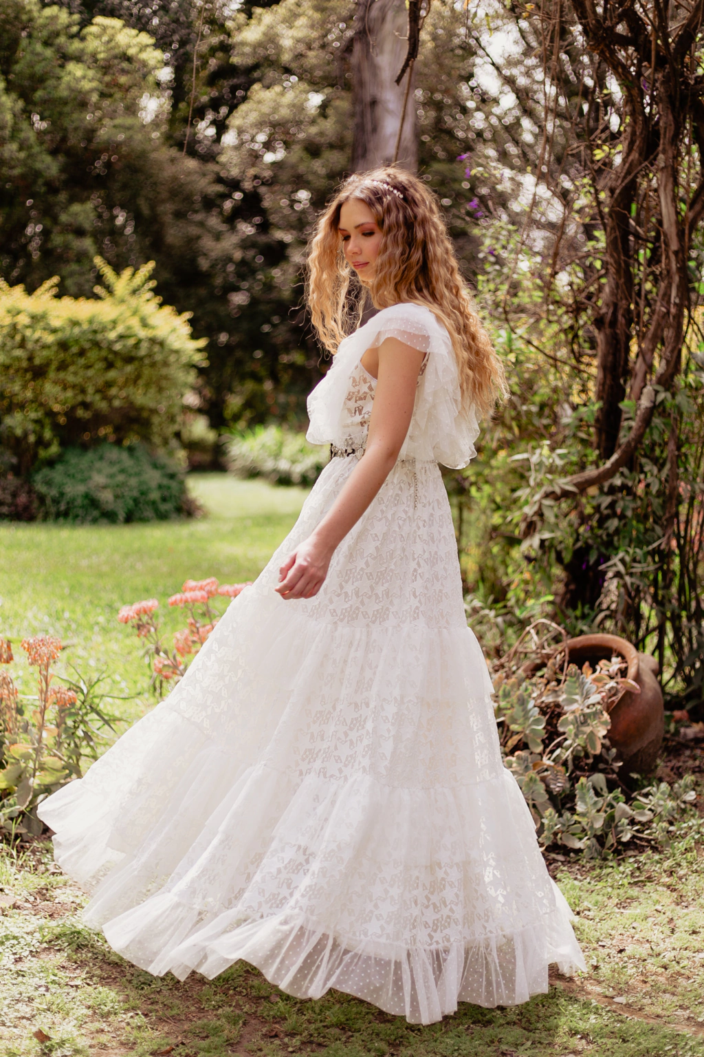 Confeccionado en un encaje fantasía de estrellas, combinado magistralmente con plumetí blanco, este vestido es un sueño celestial que hará que tu día especial brille aún más.