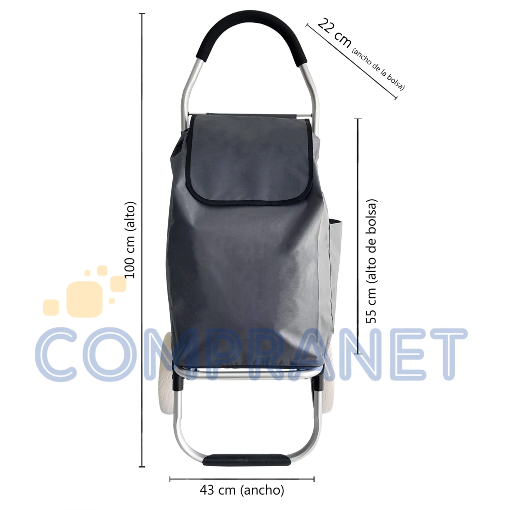 Carrito de Compras Grande con cuerpo de aluminio, bolsa de tela impermeable y 2 ruedas grandes siliconadas, ideal para grandes compras, de gran espacio, ligereza y durabilidad.Su diseño plegable permite un almacenamiento compacto, ahorrando espacio en el hogar. La bolsa de lona grande, hecha de poliéster impermeable y lavable, se saca fácilmente para lavar, lo que garantiza una higiene óptima después de cada uso.Tiene 2 bolsillos muy útiles, uno, en uno de sus costados y otro detrás para facilitar y tener más a mano el monedero, celular etc...El carrito está equipado con un mango ergonómico de ABS plástico, con protector de goma espuma diseñado para ofrecer un agarre cómodo y resistente a los golpes.Sus ruedas de plástico grandes y resistentes, garantizan una movilidad suave y duradera, ideales para diversos tipos de superficies. Se puede usar como carro para trasladar, sacándole la bolsa de tela, o como carrito de comprasMaterial: estructura de aluminio, bolsa de lona impermeable y lavable y ruedas de plástico.Colores: Rojo, Negro y Gris.Medidas del Carrito: 100 cm (alto) x 43 cm (ancho)Medidas de la bolsa: 55 cm (alto) x 33 cm (ancho) x 22 cm (prof.)