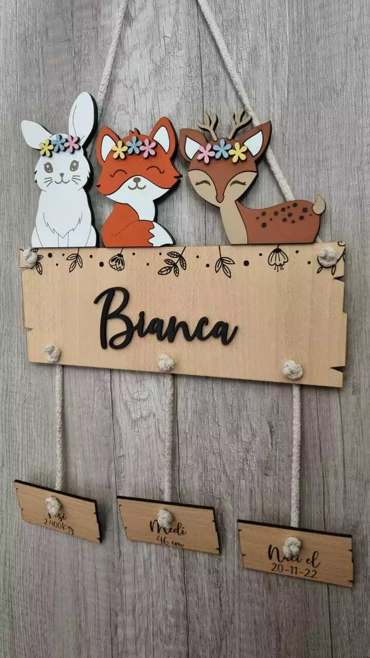 Cartel de nacimiento animalitos del bosque con cartelitos colgantes con datos grabados