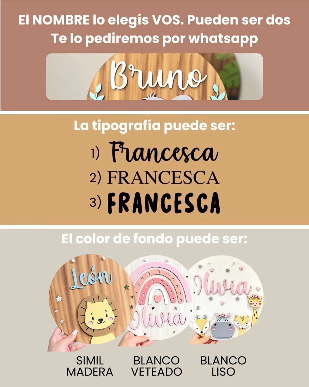 Cartel personalizado con el nombre que quieras.Espesor: 3mm de base, más las partes adicionales que van pegadas arriba, puede llegar a 6 o 9mm de espesor.Colores modificables:Se puede cambiar el color del nombre, el color de las hojas, y el color del animalito.Solo utilizamos colores LISOS. No contamos con brillo ni degradé.El color de la base puede ser: Símil madera (marrón veteado), símil madera blanca (blanco veteado) o blanco liso.Luego de comprar te enviamos whatsapp para coordinar el personalizado. La demora en fabricar es la pactada en la tienda, antes y durante inicias la compra aparecerá.