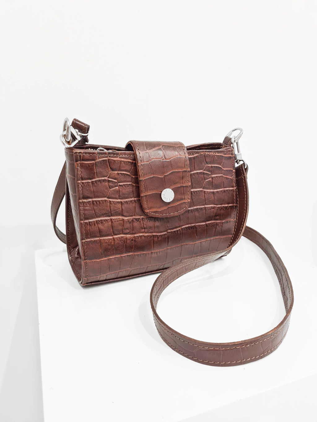 Cartera bandolera semi rígida confeccionada 100% en cuero vacuno croco, con correa regulable. Sus herrajes son de niquel y su interior forrado con lienzo. Una cartera pensada para quienes buscan simplicidad y estilo, ideal tanto para el día como para un look más formal de noche.