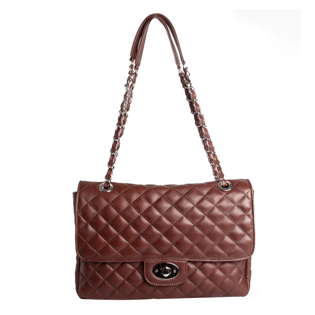 Evangelina es una cartera elegante.Realizada en cuero suave y matelaseado.Posee herraje niquelado, cadena doble uso con detalle de cuero en hombreras.Medidas: 34cm x 22cm