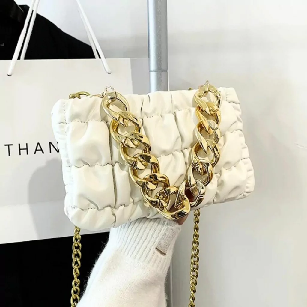 Cartera FlowMaterial: PU cuero sinteticoDetalles: Bordado matelase. Herrajes y cadena dorado. Interior forrado en tela poliéster, con un pequeño bolsillo con cierre y otro bolsillo abierto. Cadena ancha para agarre de mano corto. Cadena larga de hombro desmontable.Medidas: 13 alto x 22 ancho x 4 amplitud