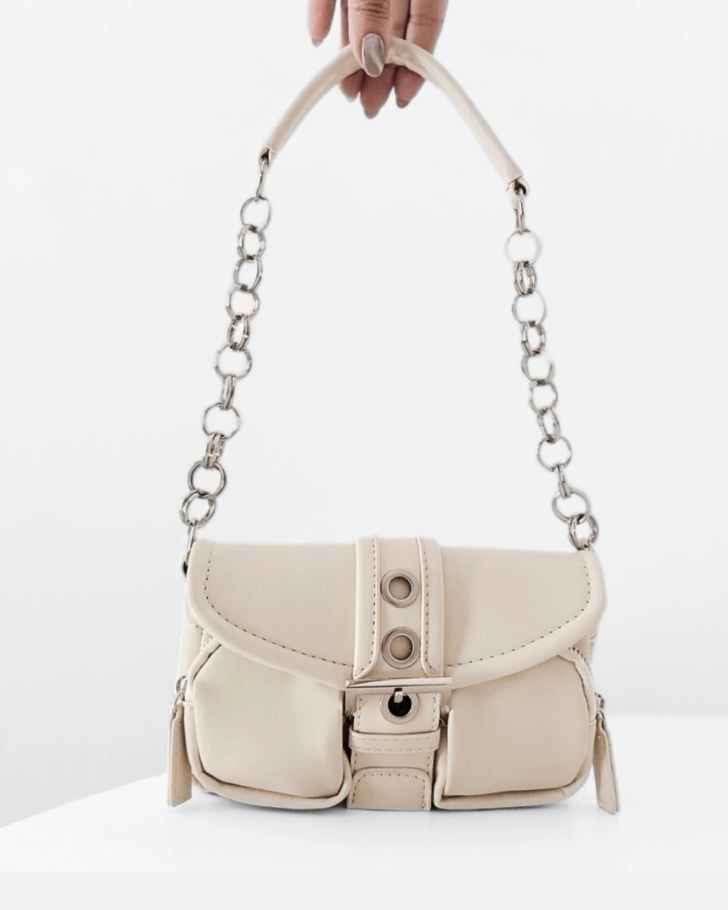 Cartera RockeraDetalles: Cartera estilo baguette. Cadena fija de hombro. Tapa que cierra con botón a presión con hebilla decorativa .Interior forrado en tela poliester con un pequeño bolsillo con cierre. Dos bolsillos pequeños externos con cierre. Herrajes en color plata.Material: cuero sinteticoMedidas: 12 alto x 23 ancho x 10 amplitud