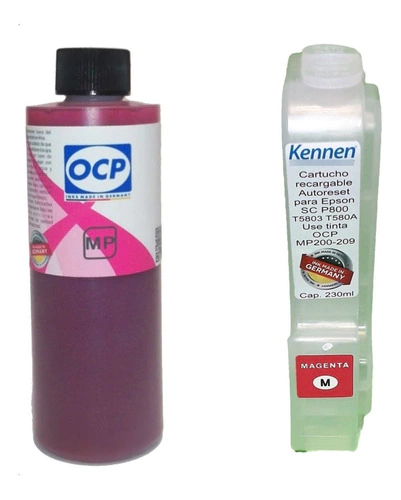 Cartucho Recargable T850 marca Kennen Alternativo para Epson P800 XXXL 250ml de tinta Alemana OCP* Vs. 80ml del cartucho de fábrica ¡Ahorrá 75% de costos con excelente calidad de impresión y cuidando tu impresora con las tintas Alemanas OCP*! Colores disponibles: negro mate, negro foto, cian, magenta, amarillo, cian claro, magenta claro, negro claro, negro claro claro Especificaciones generales: Familia de Cartuchos: T8501 / T8502 / T8503 / T8504 / T8505 / T8506 / T8507 / T8508 / T8509 NOTA: se requiere el chip del cartucho agotado para completar el programa del chip autoreset. Capacidad del Cartucho 230 ml Tinta Incluida: 250ml Tipo: tintas de alta pigmentación con Aditivos limpia inyectores, retardantes de evaporación y redispersantes. Indelebles en papel común y foto. Altísimo light y dark fading Pigmentos Polimérico de precisión. Cartuchos / Color T8501 PHOTO BLACK T8502 CYAN T8503 / T580A MAGENTA T8504 YELLOW T8505 LIGHT CYAN T8506 / T580B LIGHT MAGENTA T8507 LIGHT BLACK T8508 MATTE BLACK T8509 LIGHT LIGHT BLACK *Brother, Canon, Epson, HP, Lexmark, Ricoh, Mimaki, Mutoh y demás marcas de impresoras se mencionan al sólo efecto de orientar al consumidor sobre la compatibilidad del producto. las mismas son marcas registradas por sus respectivos dueños y no avalan ni tienen vinculación alguna con el producto ofrecido. OCP es marca registrada de OCP GmbH de Alemania quien fabrica y garantiza el producto a través de su representante en Argentina, Kennen SRL. Kennen es marca registrada de Kennen SRL.