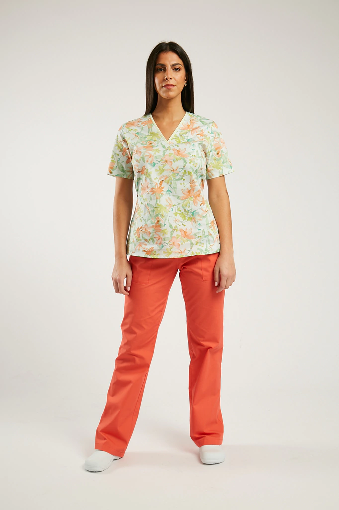 Casaca con escote en v y detalles en cuello y bolsillo con vivos combinados. Tiene tiras para ajustar en la espalda. Tela Arciel Superflex.