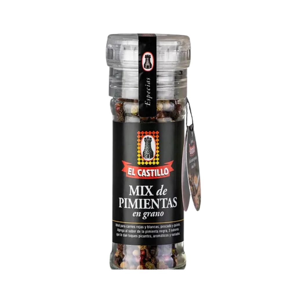 MIX DE PIMIENTAS EN GRANO - MolinilloExquisita combinación de pimientas blanca, negra, roja y verde que aporta un mix de sabores y aromas increiblePresentación: molinillo x 40gr